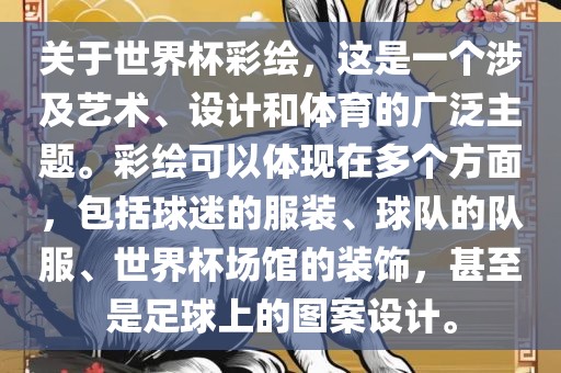 关于世界杯彩绘,这是一个涉及艺术、设计和体育的广泛主题。彩绘可以体现在多个方面,包括球迷的服装、球队的队服、世界杯场馆的装饰,甚至是足球上的图案设计。