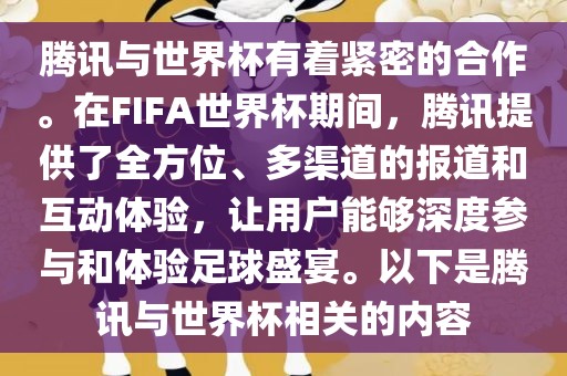 腾讯与世界杯有着紧密的合作。在FIFA世界杯期间,腾讯提供了全方位、多渠道的报道和互动体验,让用户能够深度参与和体验足球盛宴。以下是腾讯与世界杯相关的内容