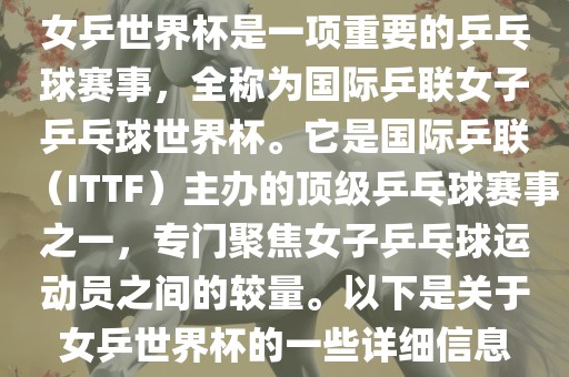 女乒世界杯是一项重要的乒乓球赛事,全称为国际乒联女子乒乓球世界杯。它是国际乒联(ITTF)主办的顶级乒乓球赛事之一,专门聚焦女子乒乓球运动员之间的较量。以下是关于女乒世界杯的一些详细信息