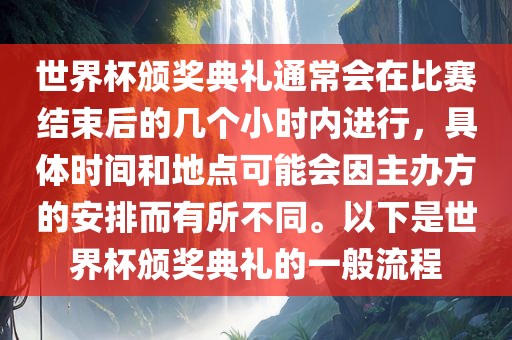 世界杯颁奖典礼通常会在比赛结束后的几个小时内进行,具体时间和地点可能会因主办方的安排而有所不同。以下是世界杯颁奖典礼的一般流程