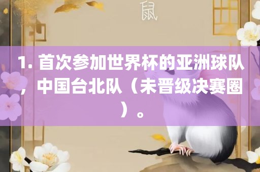 1. 首次参加世界杯的亚洲球队,中国台北队(未晋级决赛圈)。