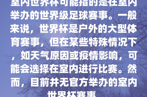如果想知道更多关于室内足球比赛的信息,可以查看相关新闻报道或访问相关论坛,一些电竞游戏也可能会有名为“世界杯”的室内赛事?!?#23460;内世界杯”这一表述可能涉及多个领域,具体需结合实际情况理解。