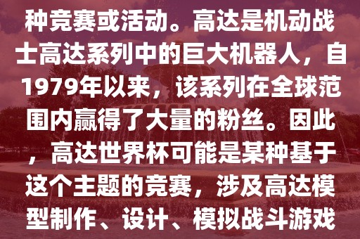 为了获取关于“高达世界杯”更具体的信息,您可以尝试在社交媒体平台上搜索相关话题,或者查看与高达相关的官方网站和论坛,不过截至当前时间,我并没有具体关于“高达世界杯”的详细信息,如果您想了解具体的活动情况,建议访问相关社区获取最新和详细的信息。
