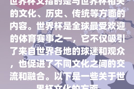 世界杯文指的是与世界杯相关的文化、历史、传统等方面的内容。世界杯是全球最受欢迎的体育赛事之一,它不仅吸引了来自世界各地的球迷和观众,也促进了不同文化之间的交流和融合。以下是一些关于世界杯文化的方面