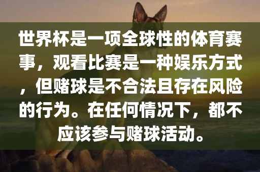 世界杯是一项全球性的体育赛事,观看比赛是一种娱乐方式,但赌球是不合法且存在风险的行为。在任何情况下,都不应该参与赌球活动。