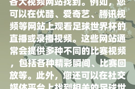 可以在各大视频网站观看足球世界杯的直播或录播视频,如优酷、爱奇艺、腾讯视频等。这些网站提供多种比赛视频,包括精彩瞬间和比赛回放等。社交媒体平台上也有相关视频分享。摘要字数控制在100-200字左右。