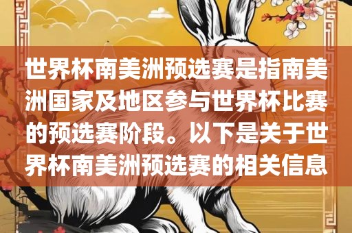世界杯南美洲预选赛是指南美洲国家及地区参与世界杯比赛的预选赛阶段。以下是关于世界杯南美洲预选赛的相关信息