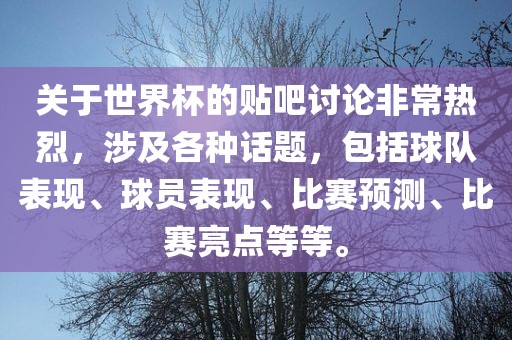 关于世界杯的贴吧讨论非常热烈,涉及各种话题,包括球队表现、球员表现、比赛预测、比赛亮点等等。