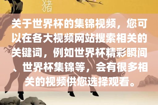 关于世界杯的集锦视频,您可以在各大视频网站搜索相关的关键词,例如世界杯精彩瞬间、世界杯集锦等,会有很多相关的视频供您选择观看。