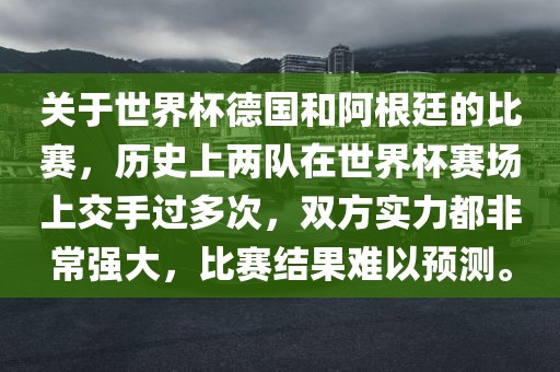 关于世界杯德国和阿根廷的比赛,历史上两队在世界杯赛场上交手过多次,双方实力都非常强大,比赛结果难以预测。