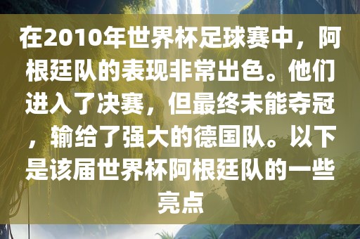 在2010年世界杯足球赛中,阿根廷队的表现非常出色。他们进入了决赛,但最终未能夺冠,输给了强大的德国队。以下是该届世界杯阿根廷队的一些亮点