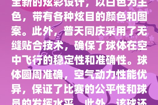 南非世界杯的官方用球名为普天同庆。这款球是由阿迪达斯公司设计生产的,其设计灵感来源于南非的标志性颜色和国旗上的图案。球体表面采用了全新的炫彩设计,以白色为主色,带有各种炫目的颜色和图案。此外,普天同庆采用了无缝贴合技术,确保了球体在空中飞行的稳定性和准确性。球体圆周准确,空气动力性能优异,保证了比赛的公平性和球员的发挥水平。此外,该球还采用了高科技的内置传感器技术,可以记录比赛中的精彩瞬间和球员的技术表现等。总体来说,普天同庆是一款设计精良、性能卓越的足球。