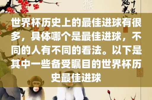 其他备受瞩目的世界杯历史最佳进球还包括:罗纳尔多在世界杯上的精彩表现、球王马拉多纳的世纪进球等,这些进球都是极具代表性的经典瞬间,具有极高的观赏价值和历史意义,由于每个人对最佳进球的评判标准不同,因此无法确定具体哪个是最佳进球,建议观看世界杯精彩集锦了解更多的经典进球瞬间。