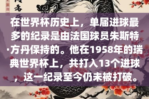 法国球员朱斯特·方丹在1958年瑞典世界杯上创造了单届进球最多的纪录,共打入13个球,这一纪录至今无人打破。他在该届世界杯上的出色表现使他成为足球历史上的传奇人物。
