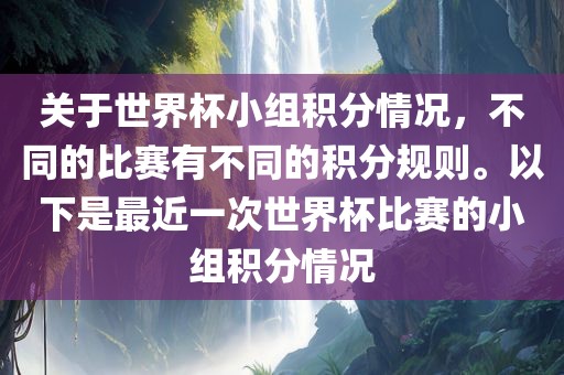 关于世界杯小组积分情况,不同的比赛有不同的积分规则。以下是最近一次世界杯比赛的小组积分情况